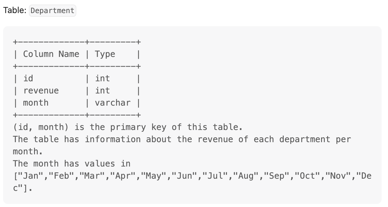 - Department 테이블에는 부서별 id, revenue, month 정보가 포함되어 있습니다.
